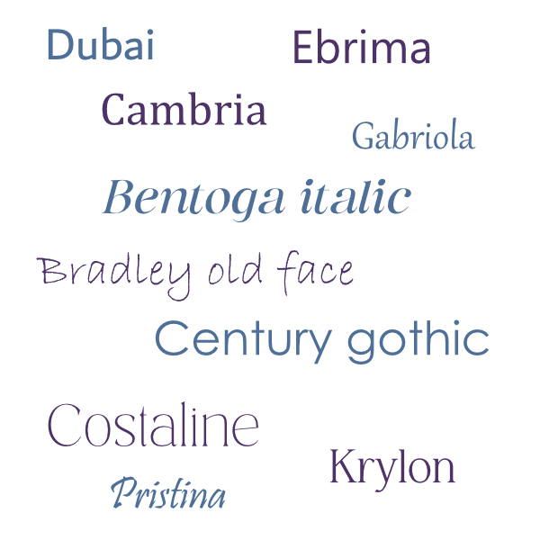 Choisis plutôt des polices aux serifs fins, délicates, littéraires. On opte aussi pour des lettres arrondies ou légèrement allongées.